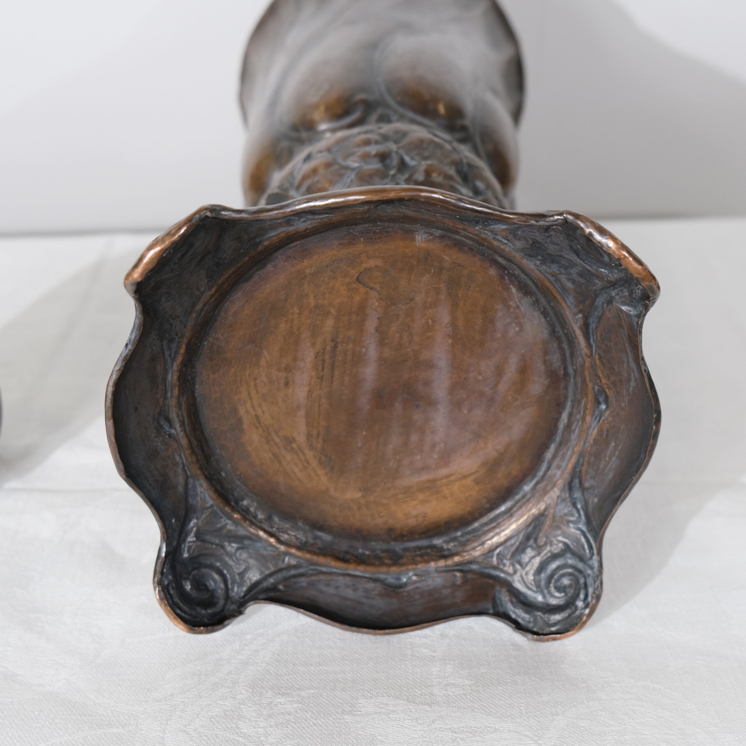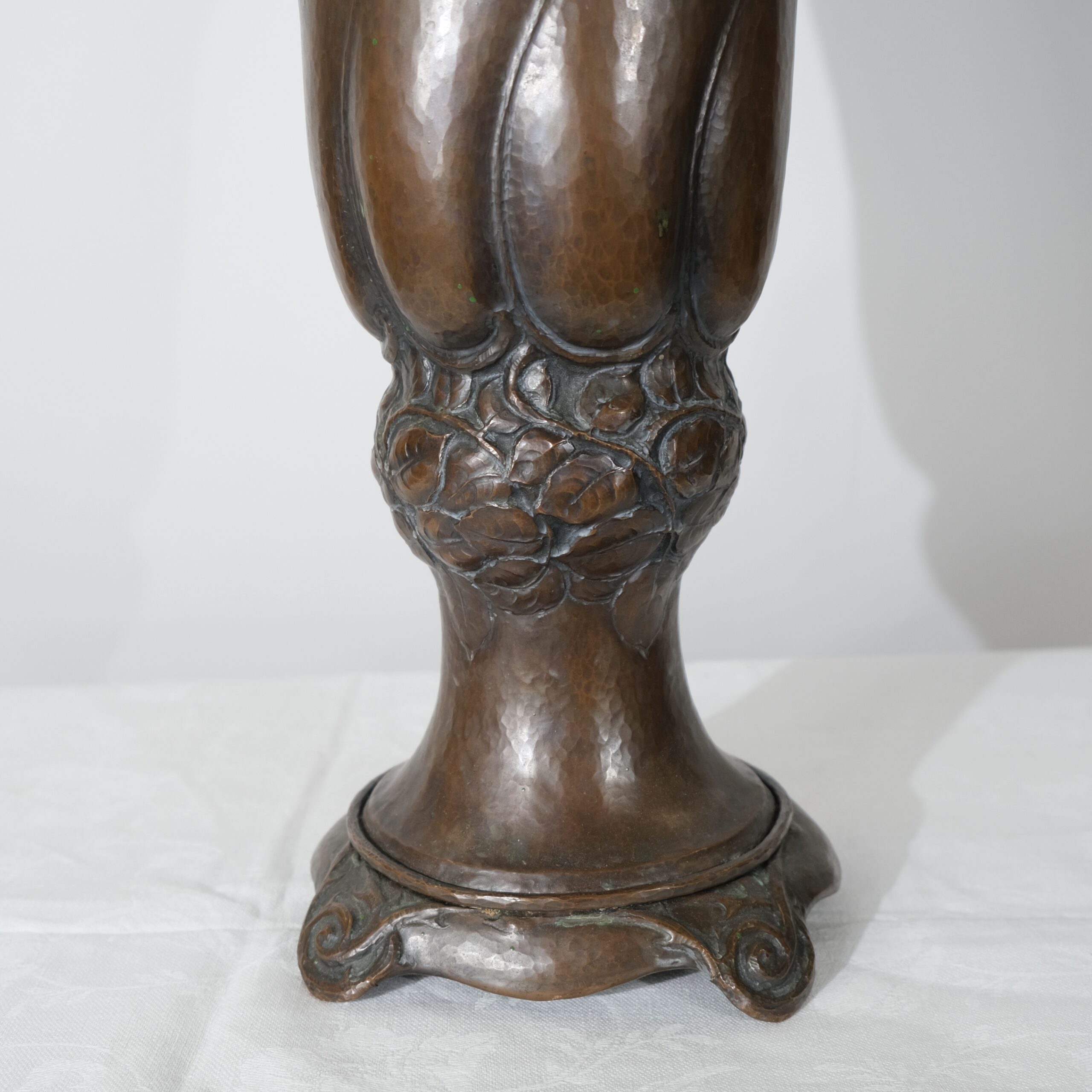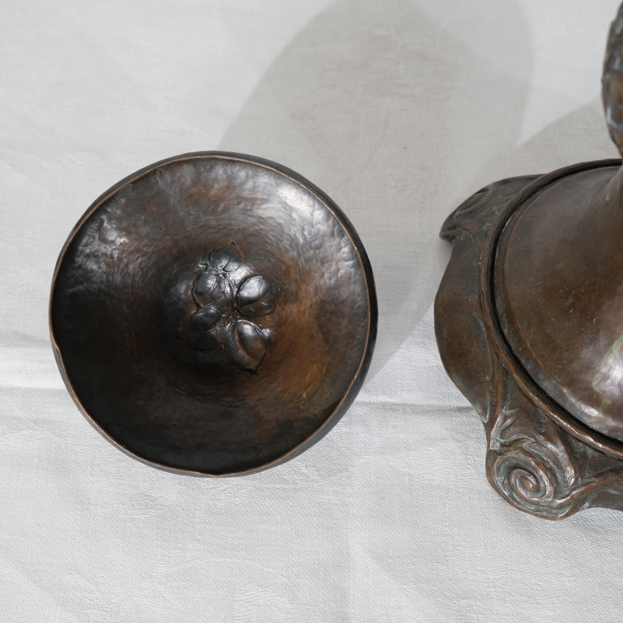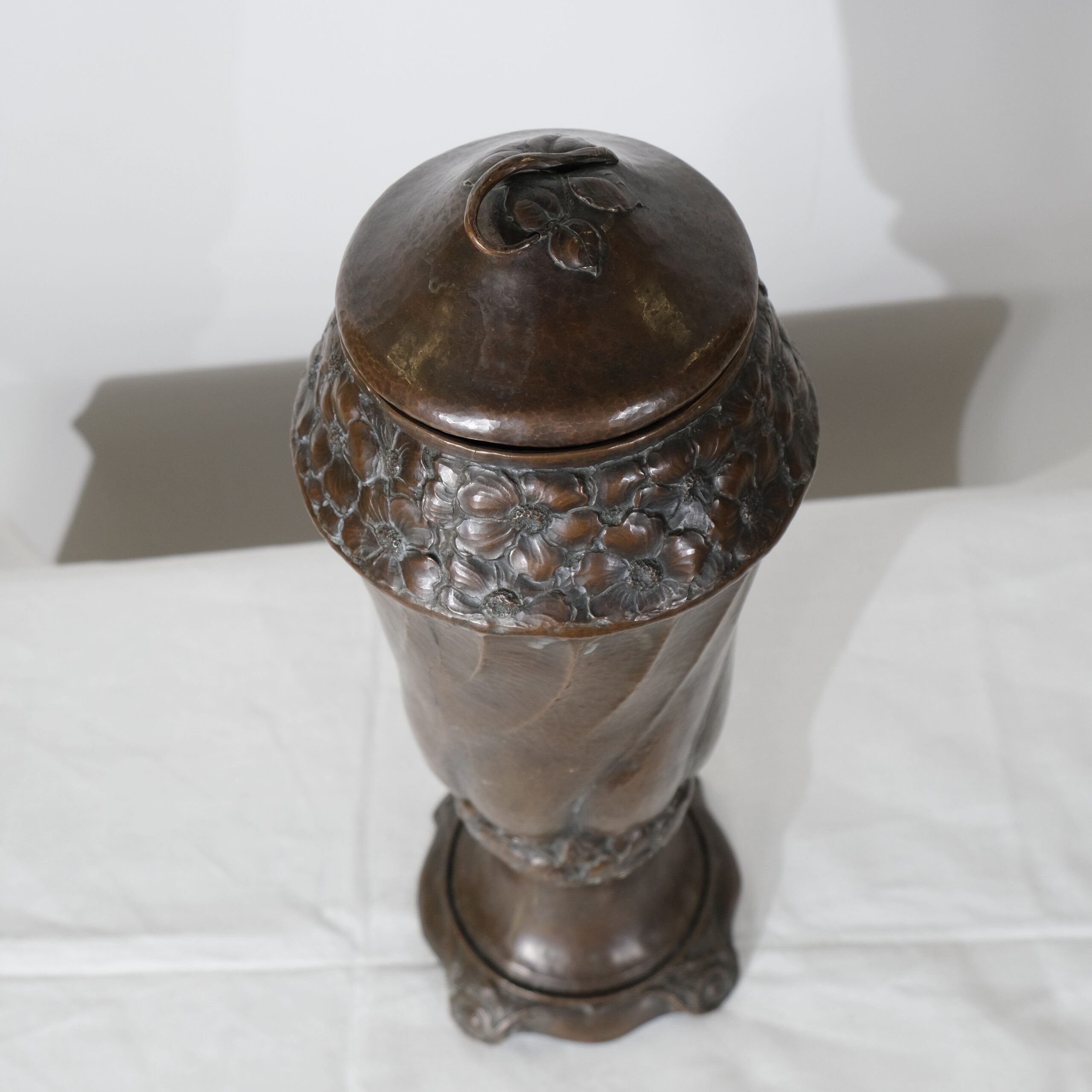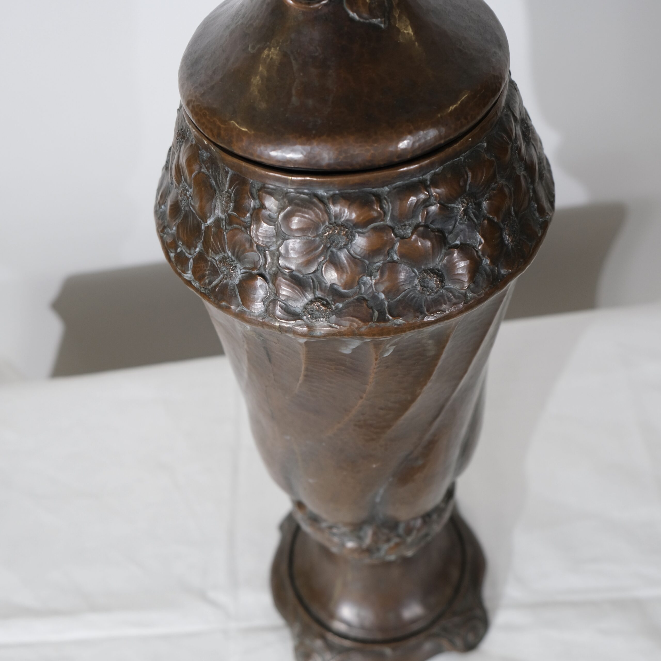 This copper vase with a lid embodies the Art Nouveau style, characterized by its organic, flowing lines and intricate detailing. The vase features a twisted, elongated form with swirling, petal-like patterns that create a dynamic sense of movement, reminiscent of natural shapes like flower buds or swirling leaves. The surface and pattern is created by hammering its inside, all handcrafted. The top and bottom sections are adorned with delicate, floral motifs that seamlessly blend into the vase's overall design, adding texture and visual interest. The lid is gently domed, topped with a handle in the shape of a leaf, and complements the vase's elegant silhouette. The base is flared with subtle, curled feet that provide stability while enhancing its graceful, nature-inspired aesthetic, typical of Art Nouveau craftsmanship.