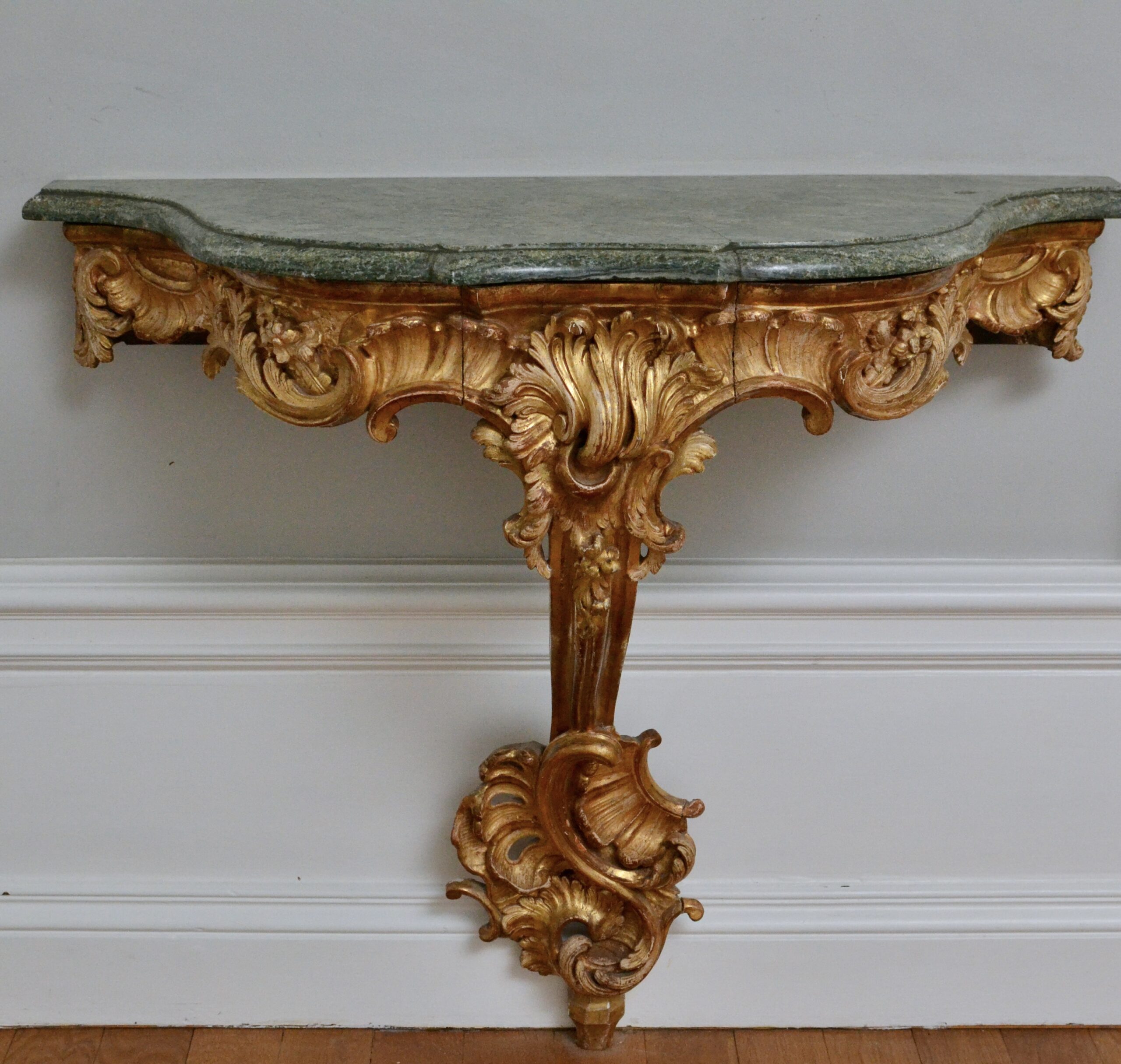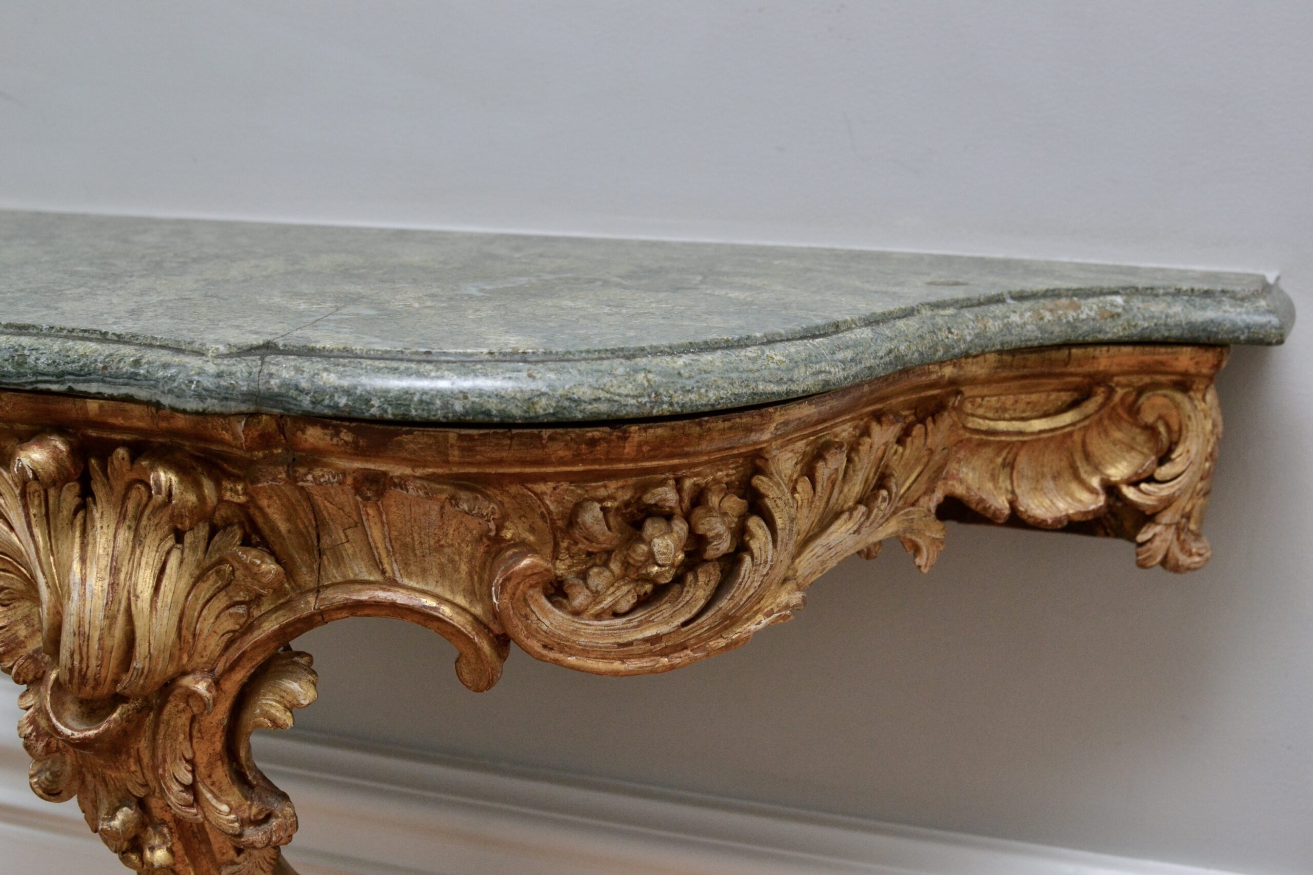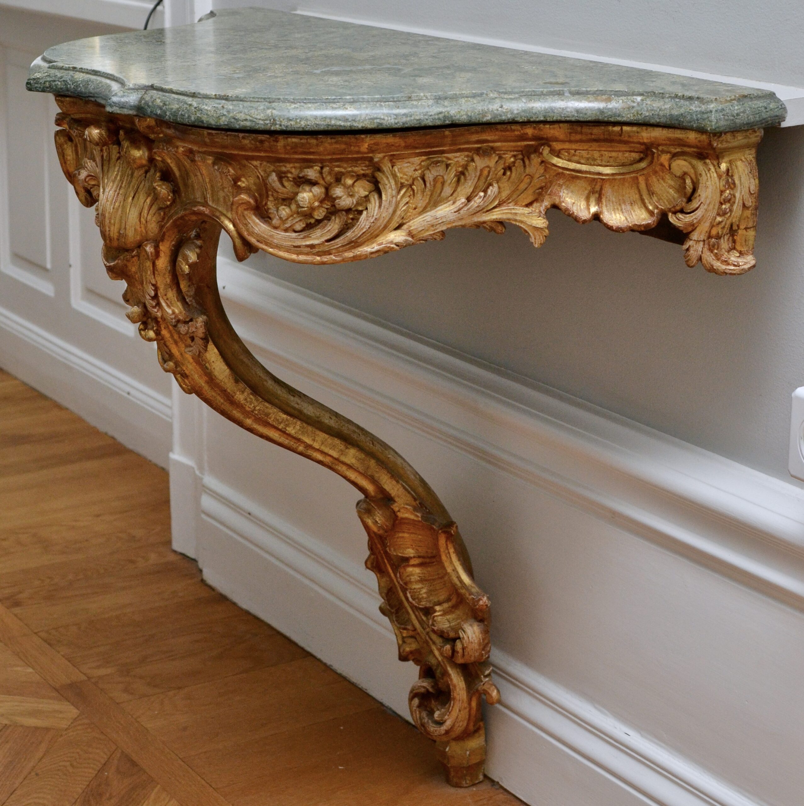 A unusual and wonderful rococo consul table made around 1760. The carvings on the legs are just exquisite and the original marble top ,Ade of Kolmårds marble has the livefuless of this stone written all over it. This is a keeper.