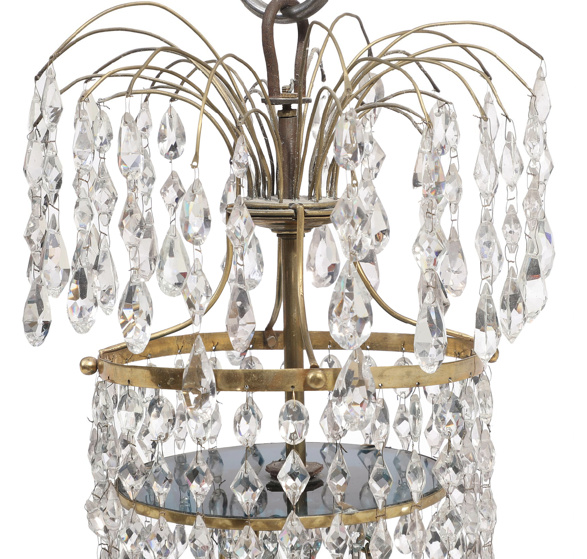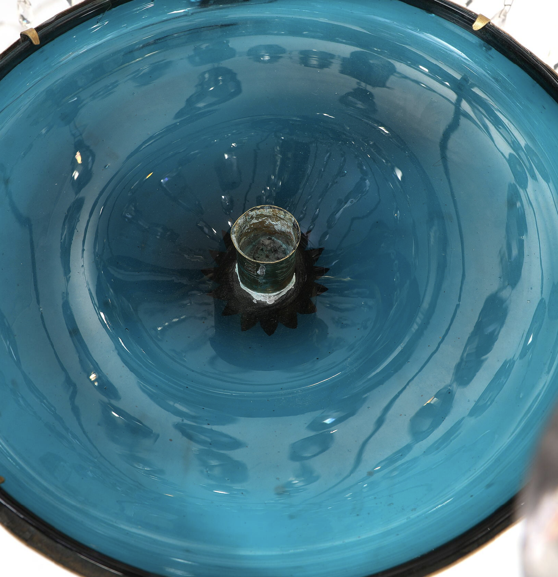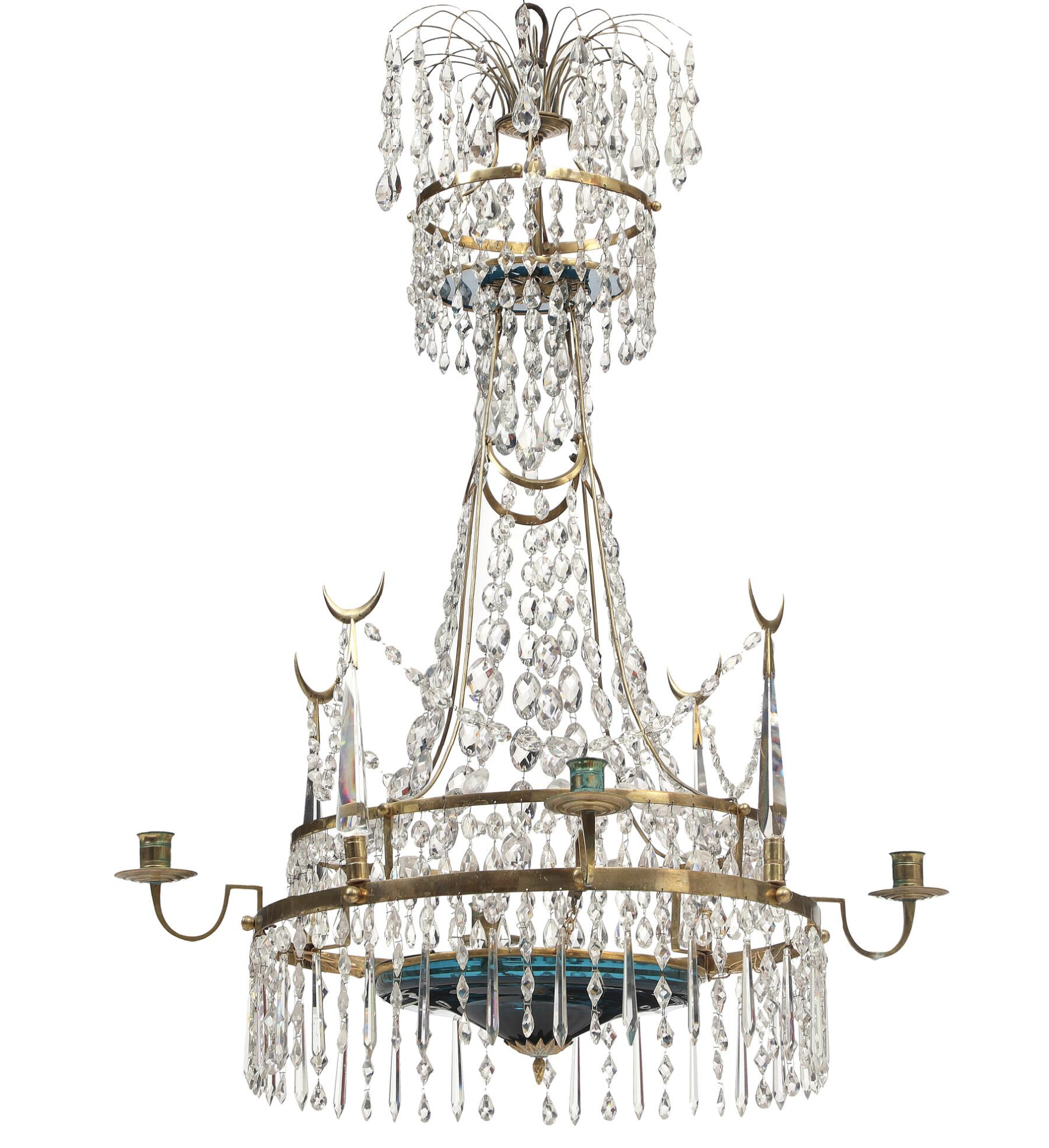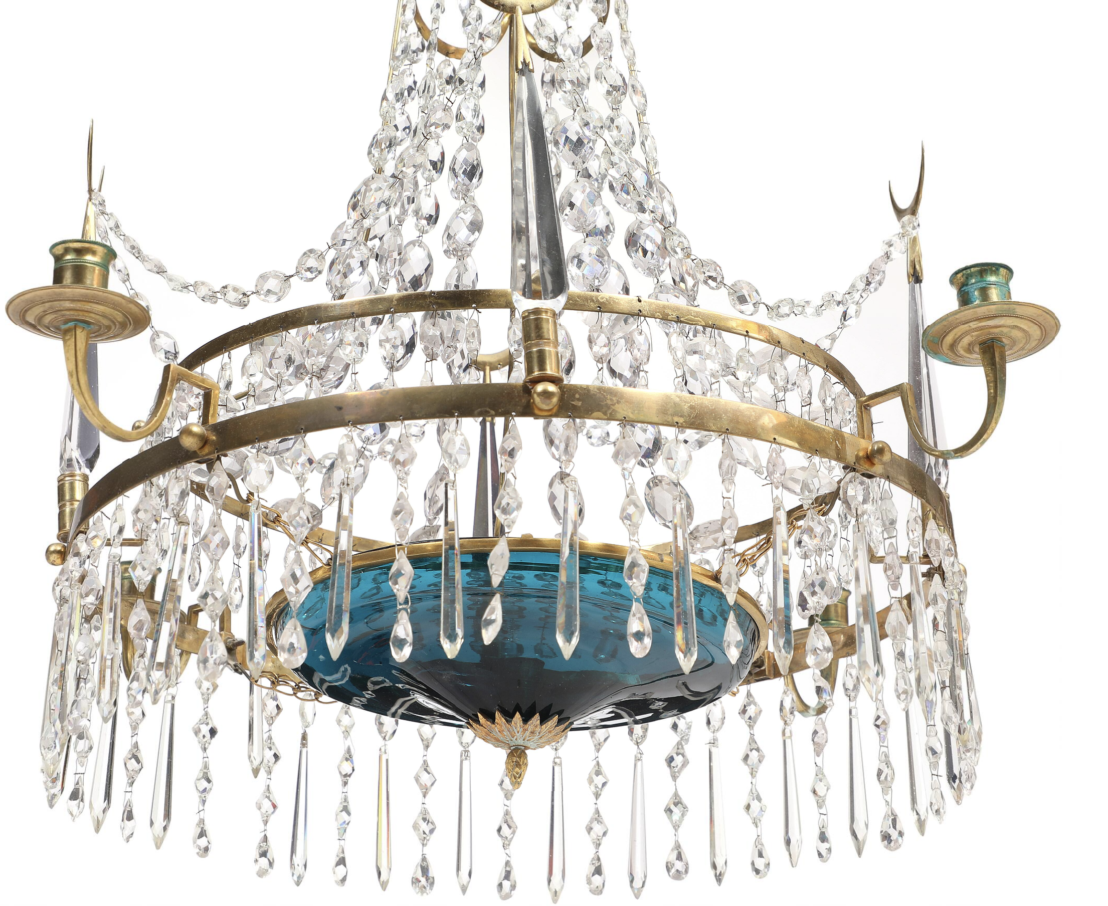 This is one of a kind. A Swedish Gustavian chandelier made around year 1800 is not hard to find but to find one in this design and with its original handblown glassbowl intact is almost impossible. The colour of the glass-bowl is amazing. This together with the very unusual design with crystal spears, crowned with half-moons of gilded brass, standing from one of the rings makes this a gem.