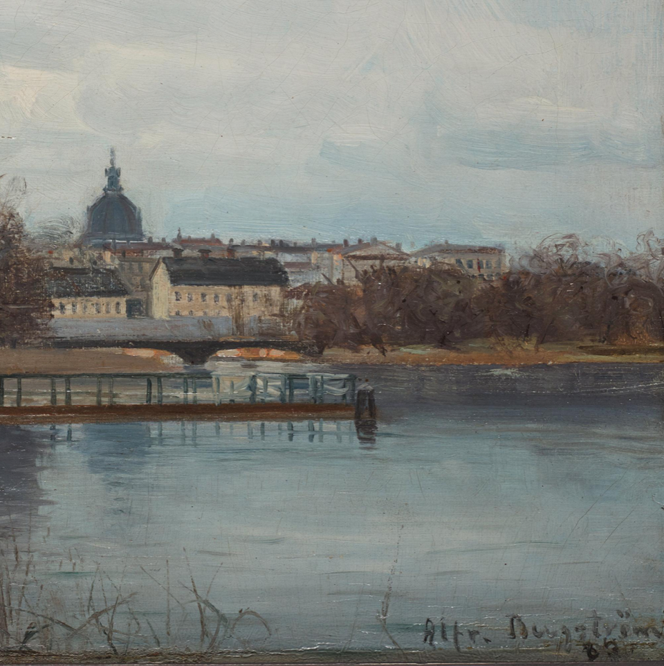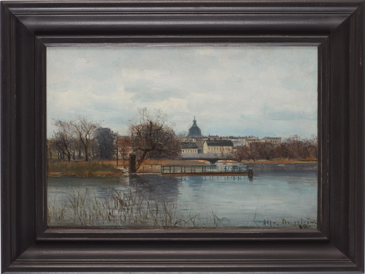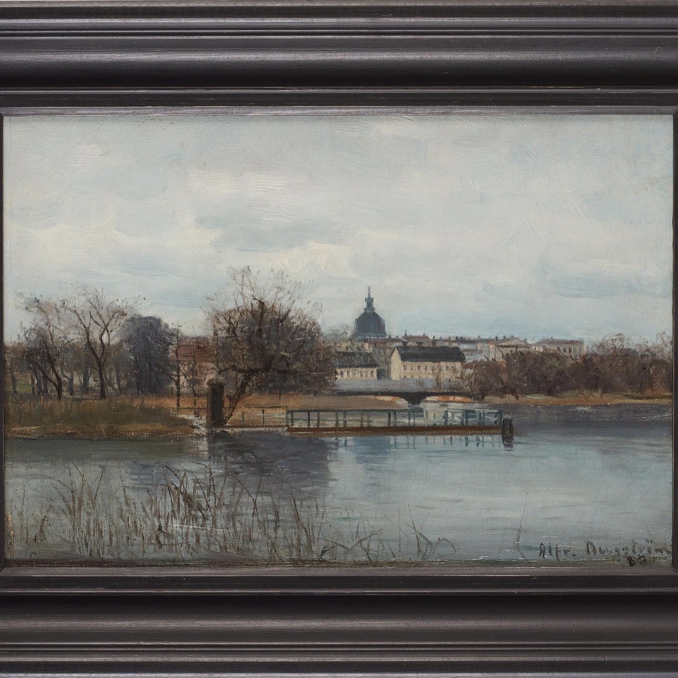 Alfred Bergström often took his motifs from Stockholm and its surroundings and the Swedish nature. Motifs from Stockholm in winter is common.
